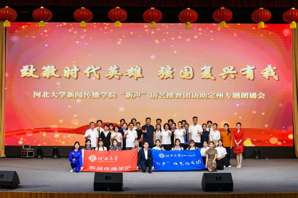 7月5日晚,“新聲”語藝推普團在定州中學藝術禮堂為該校學生及社會人士演出了“致敬時代英雄,強國復興有我”語助定州專題朗誦會。朗誦會精心設計“家國之魂,山河壯歌”“人間星火,時代脊梁”“時代浪潮,奮進強音”三個篇章,帶來了《攀登者》《心中的額吉》《乳娘》等十余個精彩朗誦作品。推普團借助舞臺朗誦藝術與沉浸式配樂,將革命戰爭年代的熱血犧牲、新中國成立初期的無畏前行及和平年代的堅守奉獻的“英雄”故事娓娓道來,贏得在場觀眾陣陣掌聲與情感共鳴。