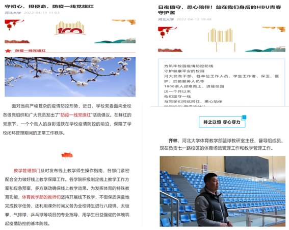 體育教學部領導的果斷決定,全體教師的義無反顧、勇于擔當得到了學校的認可和表揚,河北大學公眾號分別以《守初心,擔使命,防疫一線黨旗紅》(2022-04-11)和《日夜值守,悉心陪伴!站在我們身后的HBU青春守護者》(2022-04-12)為題對體育教學部堅持線下體育課和優秀教師代表—齊林進行了宣傳報道。