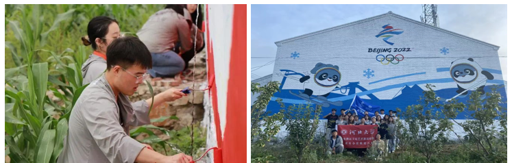 1.助力冬奧,“藝”彩飛揚。為做好2022北京冬奧會在張家口賽區的宣傳推廣,展現新時代、新鄉村、新奧運的獨特中國面貌,在實踐中檢驗專業品質,學院精心策劃、重點打造了“京張奧運文化藝術廊道繪制”專項社會實踐活動,最終圓滿完成近1.6萬平米的繪制任務。藝術學院110名學生積極響應號召,假期中從各地返校,他們心懷冬奧,駐扎在比較艱苦的環境中,蚊蟲叮咬、風吹日曬、旱廁旁作畫,吃飯的時候引來全村的蒼蠅圍觀、貓抓狗咬、三輪翻車……為趕進度工作至深夜,整個過程充滿著困難與挑戰。雖山路坎坷崎嶇,但我們的腳步從未停止,烈日將衣背濕透,汗水為鄉村譜寫新篇,繪制最鮮亮的底色。同學們在社會實踐的“第二課堂”中更好地錘煉了專業品質,在技能勞動中接受國情教育,體會實干創造美好生活的人生哲理。