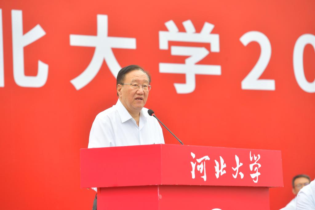 校長康樂院士發表了熱情洋溢的講話。他說,讀懂一所大學,必須從歷史的經緯中去感悟她的使命,從愛國的價值坐標系中領略她的精神,從時代的要求中去體會她的責任。河北大學建校一百多年來,始終傳承紅色基因,不斷追求卓越,陶鑄了歷久彌新的“實事求是”校訓傳統,積淀形成了教育報國、育人興邦的愛國精神,追求真理、開放包容的科學精神,百折不撓、艱苦奮斗的創業精神,心懷人民、服務社會的奉獻精神。康樂強調,大學是做學問的地方,大學期間,要主動與思想互動、與真理對話,找到眺望世界、改變世界的鑰匙,在學術創新的道路上堅定不移的走下去。他寄語廣大同學,要有內化于心的愛國情懷,將學習的目標、創新的價值融入到國家建設中來,以“創新之我”建設“創新之中國”。要有久久為功的學習態度,要耐得住寂寞,受得了挫折,穩扎穩打,步步為營,以歸零的心態迎接新的挑戰,在主動探究中構筑新的知識體系。要有樂學善思的進取精神,要主動勤勉,積極探索,努力培養獨立思考的習慣,在深入的專業學習中找到興奮點、契合點和努力方向,在好學樂學中加深對專業的認識,積淀知識財富。