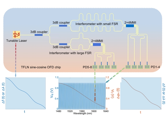 為實現這一目標,我校光信息技術創新中心姚曉天教授團隊與中山大學光電材料與技術國家重點實驗室蔡鑫倫教授團隊合作,首次提出并制成了第一個基于正余弦編碼原理的光頻率檢測光子集成(PIC)芯片。該薄膜鈮酸鋰(TFLN)芯片尺寸僅為5.5 mm×2.7 mm、測量速度高達2500 THz/s(20000nm/s)、分辨率小至2MHz、測量范圍超過160nm。通過所提出的高魯棒性算法克服了器件缺陷,并確保了OFV參數的精確量化,這項工作開辟了片上光頻率檢測的新途徑,并為涉及OFV測量的不同應用提供了巨大的潛力。