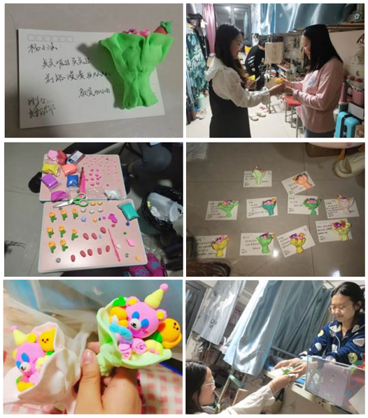 為提高同學(xué)們的心理健康水平,引領(lǐng)大家積極向上,堅(jiān)定“強(qiáng)國(guó)有我”,19級(jí)護(hù)理四班組織了“送你一朵花”團(tuán)體活動(dòng),旨在改善班級(jí)之間的人際關(guān)系,緩解同學(xué)焦慮,釋放內(nèi)在壓力,疏通心理,提高班級(jí)凝聚力。同學(xué)們通過(guò)前期準(zhǔn)備工作,上網(wǎng)學(xué)習(xí)橡皮泥花束的制作方法,大家聚集在一起,分工制作各部分,并將制作好的花束放在一起,寫(xiě)上一些鼓勵(lì)的話語(yǔ),用以緩解焦慮情緒,增強(qiáng)信心,同學(xué)們將花束和明信片一一送出,表達(dá)了美好祝愿,也促進(jìn)了同學(xué)之間的溝通交流。