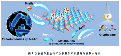 團隊青年教師于潔博士利用生物錳氧化物(BiogenicManganeseOxides,BMO)高吸附和氧化活性,建立了一種基于錳氧化菌的錳離子循環生物氧化(ManganeseOxidationCycle)新體系,在無需外加營養物質的條件下,實現了有機微污染物草甘膦(Phosphate)的降解及代謝產物的同步利用。研究成果在線發表在本領域學術期刊Journal of Hazardous Materials(中科院一區TOP,IF=14.224)的2023年首卷首期。