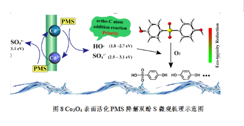 上述研究成果連續3期發表在環境功能材料領域環境工程領域期刊Chemical Engineering Journal(中科院一區TOP,IF=16.744)。此外,青年教師王澤華博士與山東大學孫孝敏教授團隊合作,采用密度泛函理論研究了尖晶石Co3O4催化劑非均相活化PMS產生活性氧化劑(HO?、SO4?-和1O2),對BPS降解的微觀機理,并對降解過程中生態毒性的演變進行了預測。研究采用密度泛函理論(DFT)方法為Co3O4/PMS體系中雙酚S的降解機理提供了新的見解。該科研成果發表在環境科學領域期刊Journal of Cleaner Production(中科院一區TOP,IF=9.297)。