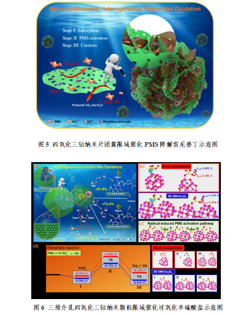 團隊青年教師馬溢陽博士與清華大學張正華副教授研究團隊合作,通過設計表面多介孔結構的四氧化三鈷納米片,可以實現反應物分子穿梭進入納米片團簇空間限域內,在限定空間中發揮氧化降解效能;提出了一種液相快速還原法,可以實現活性位點重生且富集氧空位,使得催化劑具有持久有效的催化性能。形成了調控催化劑結構形貌特征以實現催化性能提升與理化性質優化的新策略。進一步,通過密度泛函(DFT)理論計算證實,有序排列的四氧化三鈷納米顆粒對目標污染物分子具有更強的吸附能和更低的活化能壘。電子順磁共振(EPR)技術也揭示這種結構調控手段可以實現體系中單線態氧的生成,更重要的是激發多重氧化作用機制共存于二甲胺類PPCPs的降解過程。