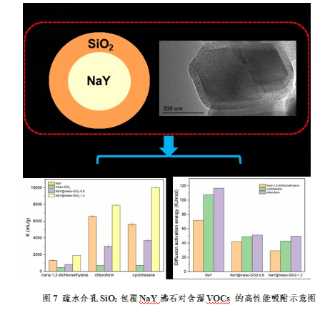 團隊青年教師劉慧娟博士與南京大學環境學院龍超教授研究團隊合作,用疏水性的介孔SiO2包覆NaY沸石合成了核殼復合材料NaY@meso-SiO2。該材料具有優異的疏水性,在含濕條件下對VOCs表現出良好的吸附性能,此外,介孔結構的外延生長也顯著促進了VOCs在復合材料上的吸附擴散。該研究為提高NaY沸石的疏水性和擴散性用于高效去除VOCs開辟了一條有前景的途徑。