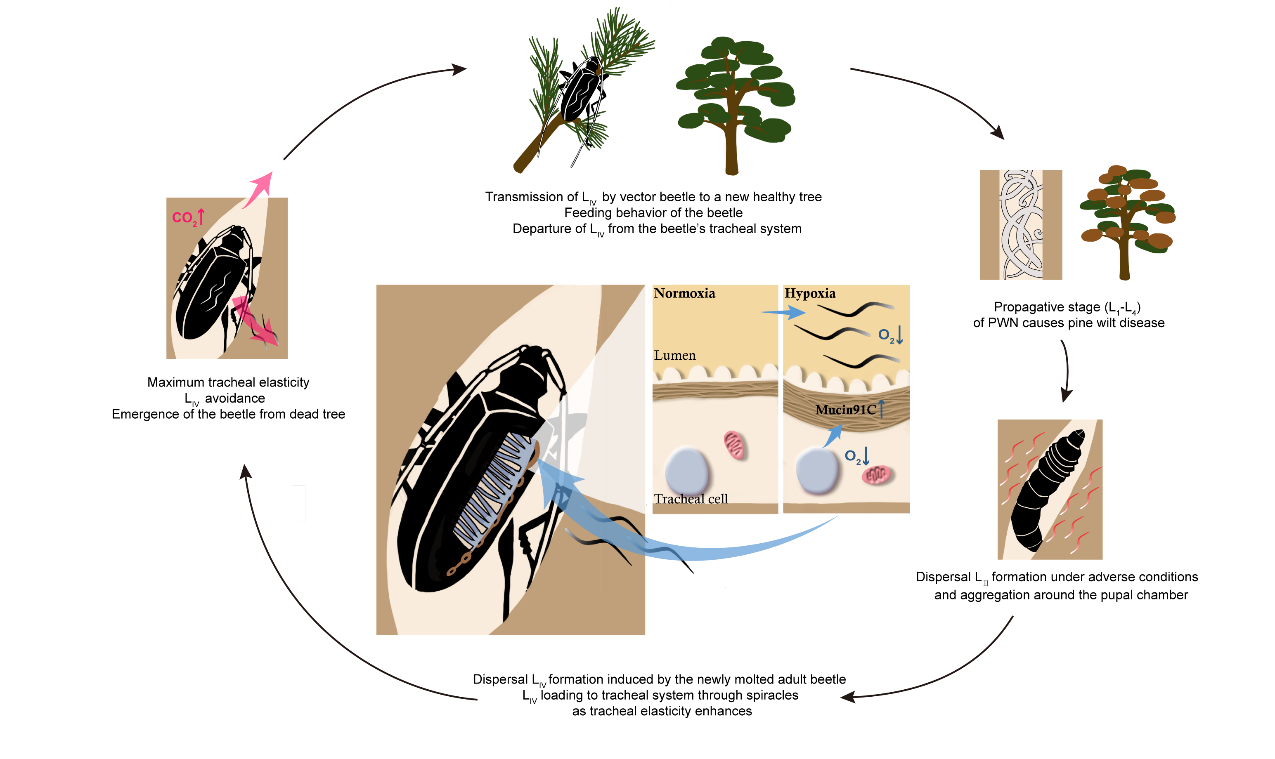 松材線蟲(PWN,Bursaphelenchusxylophilus)是引起松樹枯萎病的主要致病因子,原產自北美,后入侵至亞洲和歐洲,給入侵地森林生態系統造成毀滅性破壞。松材線蟲的自然傳播必須依賴媒介昆蟲的攜帶,媒介天牛對線蟲的承載量決定了其傳播效率。氣管是媒介天牛攜帶線蟲的主要部位,每只媒介天牛氣管中平均攜帶1.5萬頭,最高可達28萬頭松材線蟲。但天牛的氣管系統如何耐受大量的線蟲仍然是一個懸而未決的問題。